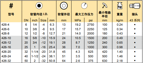 適用介質(zhì):石油基液壓油,水乙二醇,潤滑油,空氣和水。用于1.7MPa以上的空氣時(shí),軟管需針刺。