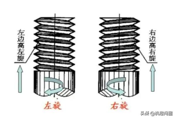 擴(kuò)展:1.螺紋旋向快速判別放法:將螺桿垂直于地面,看螺紋牙的那條斜線,左邊高左旋,右邊高右旋;右旋螺紋順時(shí)針擰時(shí)旋入,左旋順時(shí)針擰旋出,如下圖;