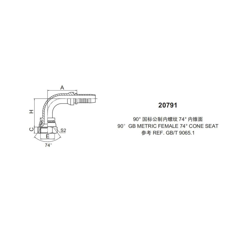 永華標(biāo)準(zhǔn)扣壓式接頭 2079190國際公制內(nèi)螺紋 74外錐面90 GB METRIC FEMALE 74 CONE SEAT參考標(biāo)準(zhǔn):REF.GB/T 9065
